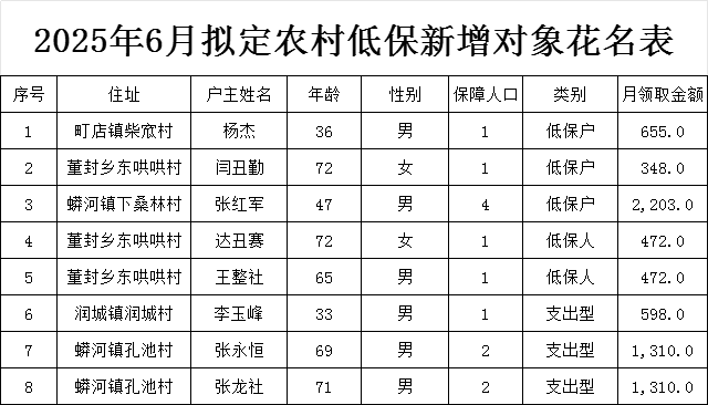 根据《阳城县民政局关于印发<阳城县最低生活保障对象审核确认实施细则>的通知》(阳民字〔2022〕22号)文件要求,现将我县2025年6月拟定农村低保新增对象杨杰等8户13人予以公示,接受社会各界人士监督。