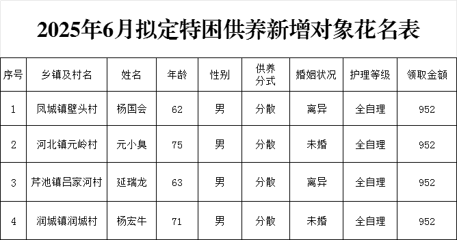 根据《阳城县民政局关于印发<阳城县特困人员认定办法>的通知》(阳民字〔2022〕28号)文件要求,现将我县2025年6月拟定特困供养新增对象杨国会等4人予以公示,接受社会各界人士监督。