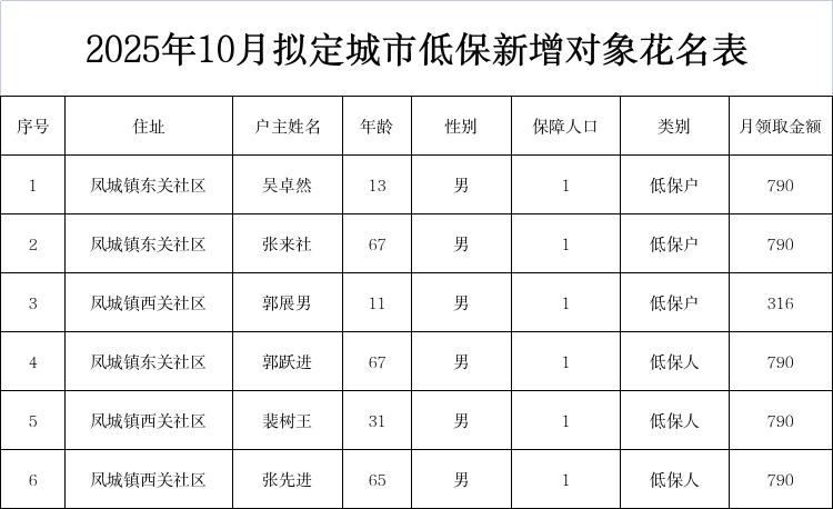 根据《阳城县民政局关于印发<阳城县最低生活保障对象审核确认实施细则>的通知》(阳民字〔2022〕22号)文件要求,现将我县2025年10月拟定城市低保新增对象吴卓然等6户6人予以公示,接受社会各界人士监督。