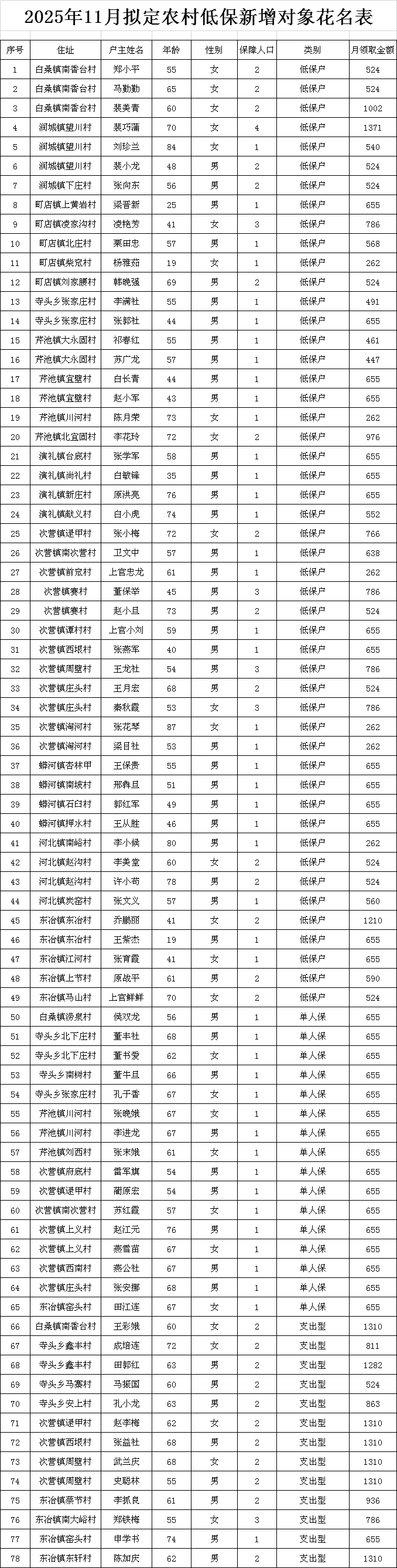 根据《阳城县民政局关于印发<阳城县最低生活保障对象审核确认实施细则>的通知》(阳民字〔2022〕22号)文件要求,现将我县2025年11月拟定农村低保新增对象郑小平等78户117人予以公示,接受社会各界人士监督。